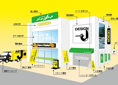 電照看板 / ポール看板 / 突き出し看板 / 壁面看板 / 懸垂幕 / テント看板 / スタンド看板 / 立て看板 / ガラス面文字 / ネオンサイン / イルミネーション / 写真入り看板 / 壁面シャッター文字書き / チョークアート看板 / 昔ながら手書き看板